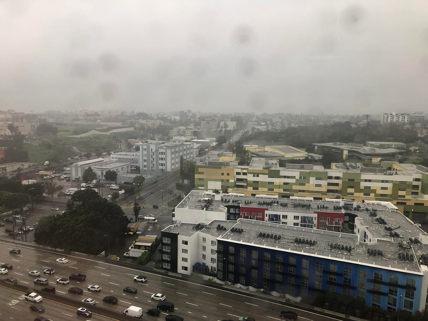 When they do, we are taken by surprise, disoriented, removed from all sense of geographic coherence. Traffic loses all semblance predictability, the wet turns the freeway into Fury Road. People stumble around in forty degree weather wearing shorts, sandals, and t-shirts, as if they can will back the warm weather.