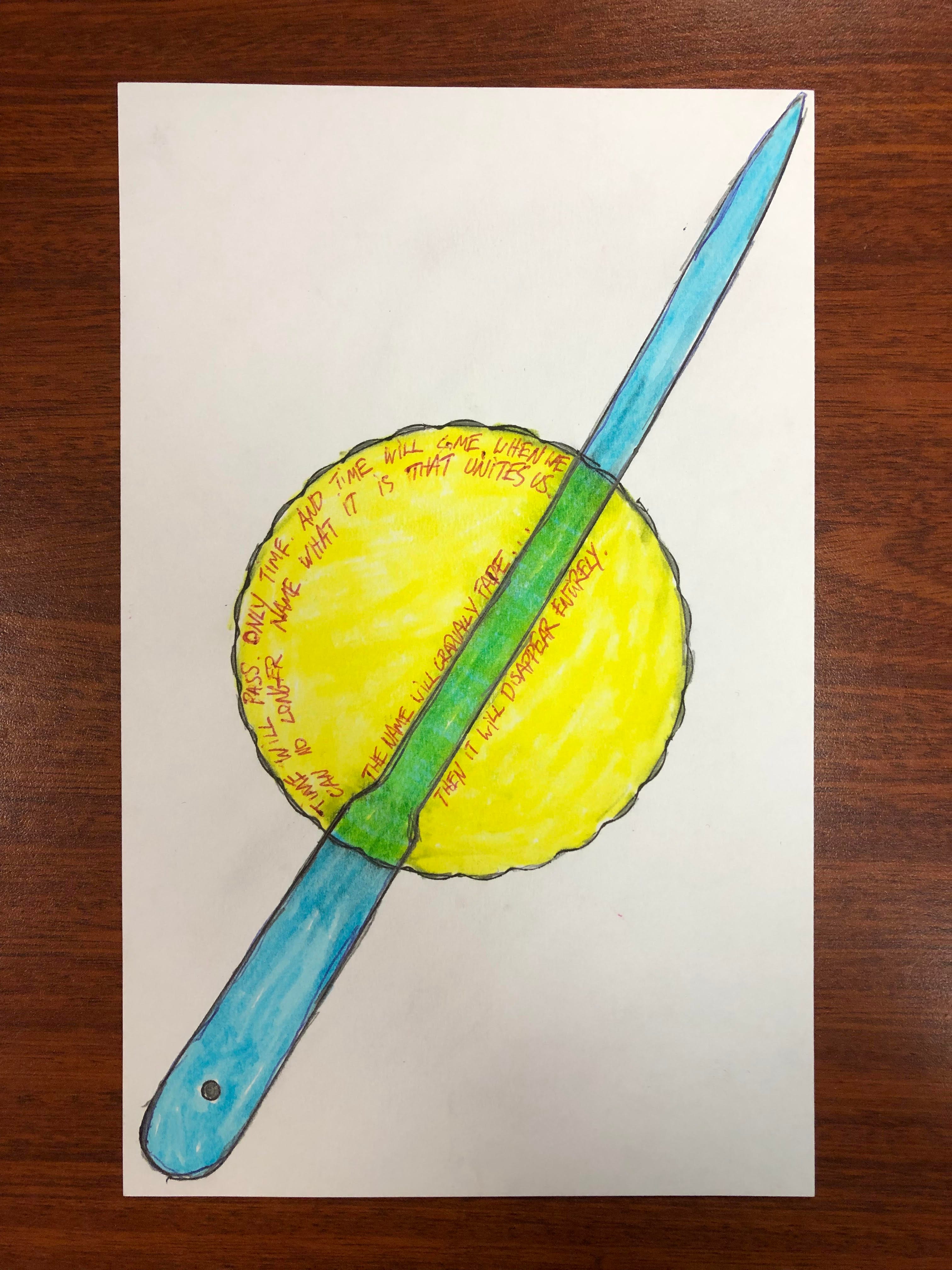 First picture. The catastrophe of forgetting, in the shape of a letter opener and a drinking cup. Childlike tracing with pencil and pen, a bit of coloring with blue and yellow highlighters.